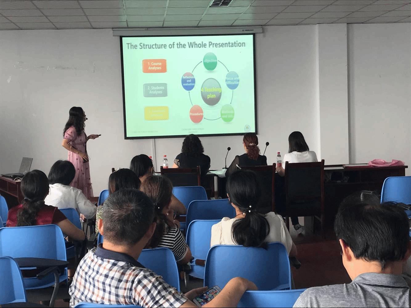 6月14日下午4:00,44118太阳成tyc城集团首届说课比赛在一教604举行。44118太阳成tyc城集团分管教学的副院长唐淑华教授、许楠博士,教学助理肖祎博士以及大学英语教研部的全体教师及部分英语系教师到场观摩,比赛聘请了学院资深的教学骨干鄢家琼、谭文芬副教授、肖祎博士作、担任评委。