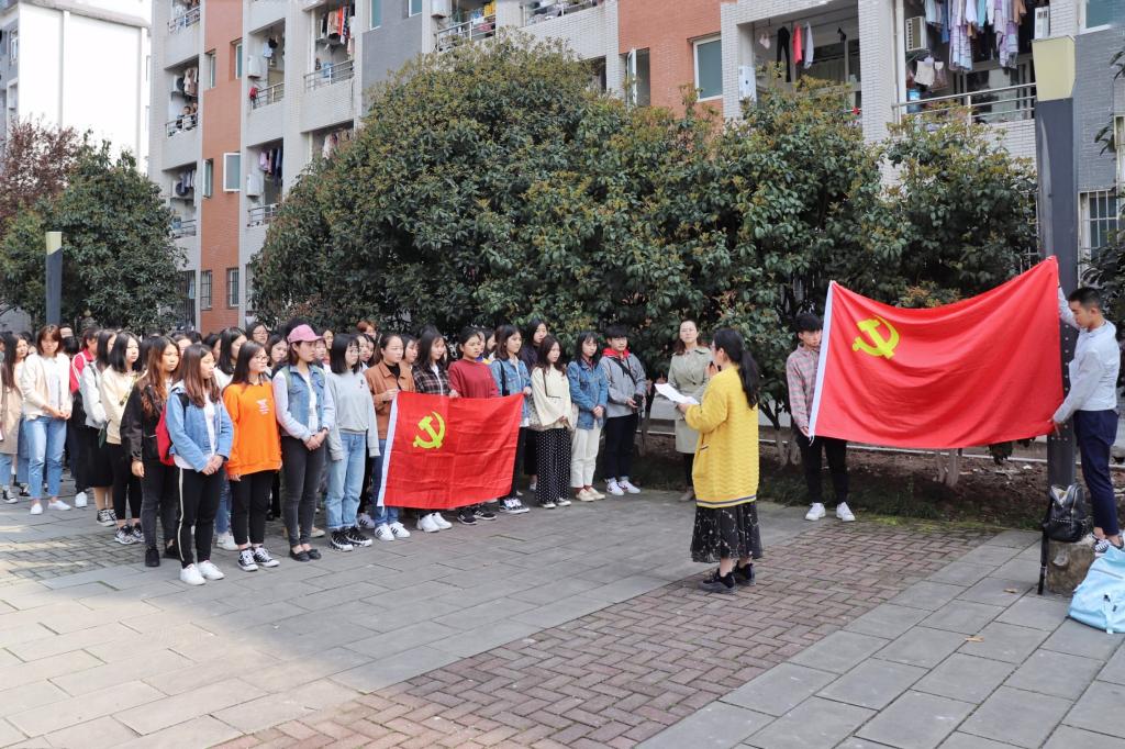 活动中,任老师向大家介绍了此次活动的目标及流程,并带领大家进行入党宣誓活动。毕业生党员张宁向大家宣读了《44118太阳成tyc城集团学生党员示范制实施办法(修订稿)》,并作为学生党员代表发言,表示作为学生党员要发挥好模范带头作用,要在思想、学习、工作、日常生活等各个方面中做好榜样。