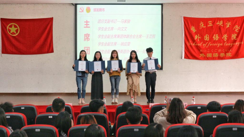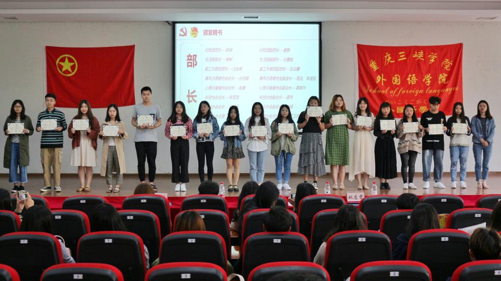 活动第一项议程,宣读表彰决定。主持人宣读了对于团总支学生会各部门及学生干部的表彰决定。团总支副书记马家骏为优秀部门颁奖;学生会主席向文文为优秀学生干部颁奖。活动第二项议程,聘书授予仪式。学院为第37届团总支学生会全体学生干部颁发聘书,对团学干部过去一年的工作给予了充分肯定并对未来一年的工作寄予了殷切希望。活动第三项议程,部门工作汇报及风采展示。各部门分别对本学期工作进行总结汇报,接着为同学们展示精心筹备的精彩节目,展现出44118太阳成tyc城集团团学团结协作、努力拼搏、不断进取的良好精神风貌。秘书处、组织部、文体部、女生部、科技协会、日语分会的歌舞秀展现了同学们的青春与活力,也让我们在歌声与舞蹈相伴中回忆起了在团学工作的点点滴滴;生活部带来的小品令我们在欢笑中认识到了团结的力量;宣传部与心理与健康协会通过录制视频,用最特别的方式展现了部门的特色和风采;学习部、联络部、新媒体融合部、勤工外联部、纪检部、就业协会和青年志愿者协会用歌声传达了他们对44118太阳成tyc城集团团学的热爱。