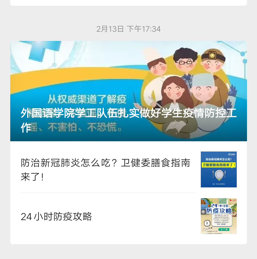 利用线上宣传阵地,提高全院学生的防控意识。疫情期间,隔离了病毒,隔离不了爱,隔离不了学院对同学们的牵挂。学院通过公众号、学生QQ、微信群和家校联系群等多种方式及时把学校的决策部署、防控疫情的知识、抗击疫情的动态传达出去,让每一位同学及时了解学校对于疫情防控所作出的努力,团结起抗击疫情的强大能量。通过电话、微信等方式与湖北籍学生保持联络,将国家和学校学院的关怀传达到位。及时跟进学生的思想状况变化,做好心理压力排解与疏导工作。学工人员及时将学校《关于2019-2020学年第2学期疫情防控期间本科教学工作安排的通知》转发给学生及家长,指导、督促学生做好迎接网络上课的相关准备,确保学院教学工作顺利进行,同时引导学生在家多学习、多锻炼,拒绝慵懒,争取在2020年英语专业四级考试中再创佳绩。