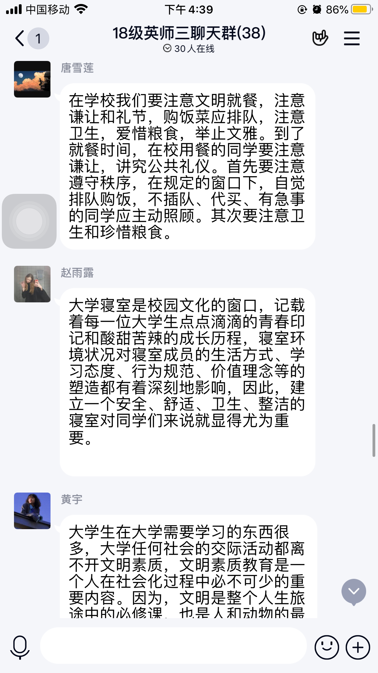 2018级英语4班的王丹同学分享看法:“文明礼仪养成教育不仅是个体道德、品质和个性形成的基础教育,也是提高全民族道德素质、振兴民族精神及建设社会主义精神文明的基础教育。作为新时代大学生,我们应该有良好的文化文明与综合素质。”