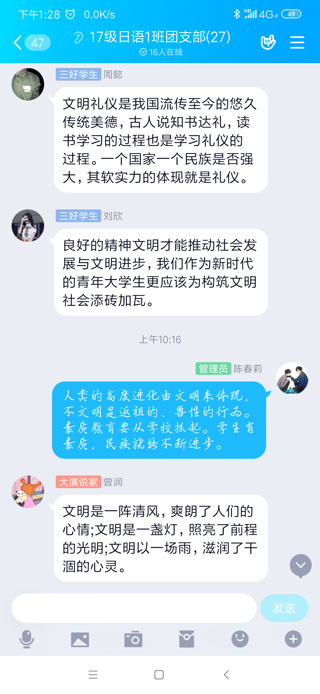 2017级日语1班方雨凡同学说到:“文明建设是人的全面发展的前提条件和基本保障,是实现人的全面发展的必由之路和必然结果,人的全面发展是文明建设最重要的终极目标。努力建设体现社会主义特点、时代特征和具有特色的校园文化,对于创建文明校园,推进素质教育改革发展,提高学生的综合素质有着十分重要的意义。”