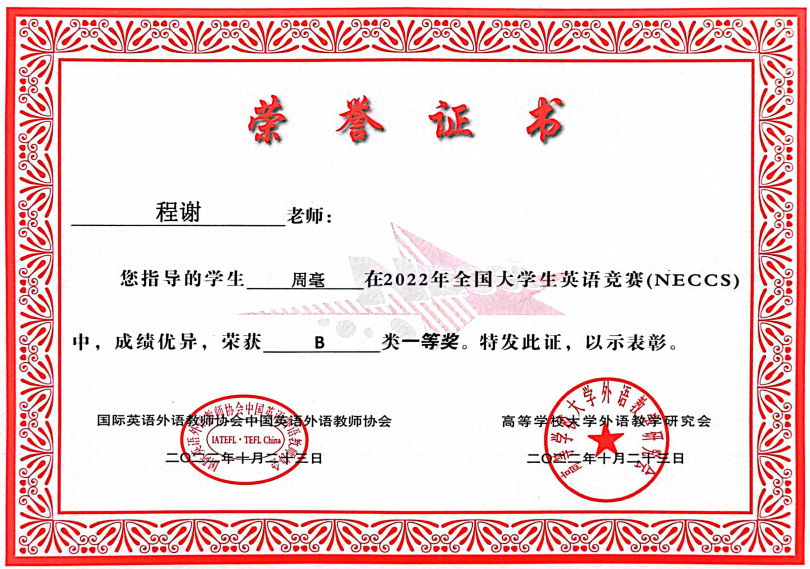 我院程榭老师指导的学生周毫在2022年全国大学生英语竞赛(NECCS)中,成绩优异,荣获B类一等奖。我院向此表示热烈的祝贺!