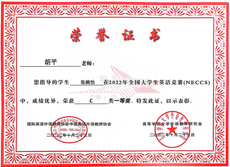 我院胡平老师指导的学生张婉怡在2022年全国大学生英语竞赛(NECCS)中,成绩优异,荣获C类一等奖。我院向此表示热烈的祝贺!