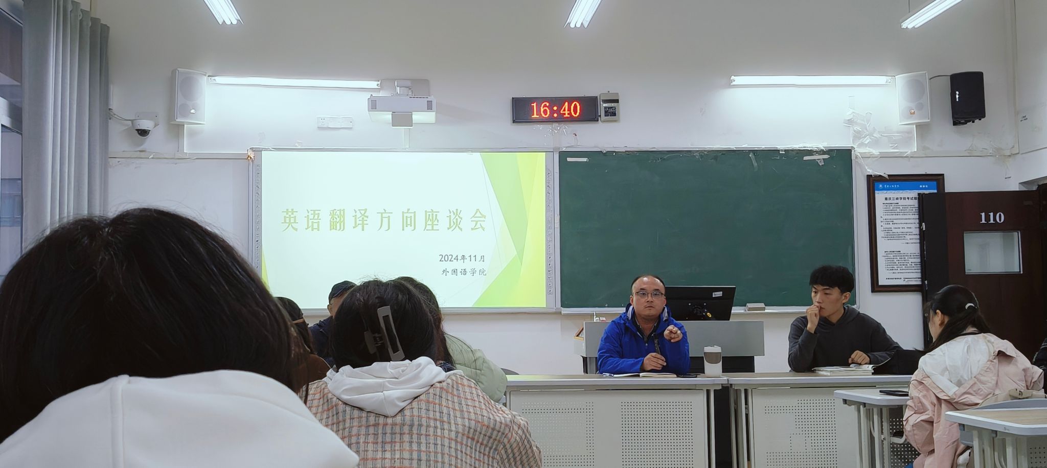 2024年11月14日下午四点,44118太阳成tyc城集团在博1-110举行了英语翻译方向学生座谈会。24级、23级、22级翻译方向学生代表参加了座谈会。出席座谈会的任课老师有肖祎、赵路华、王浩、戴倩倩、张开心等。座谈会由英语系副主任赵路华主持。