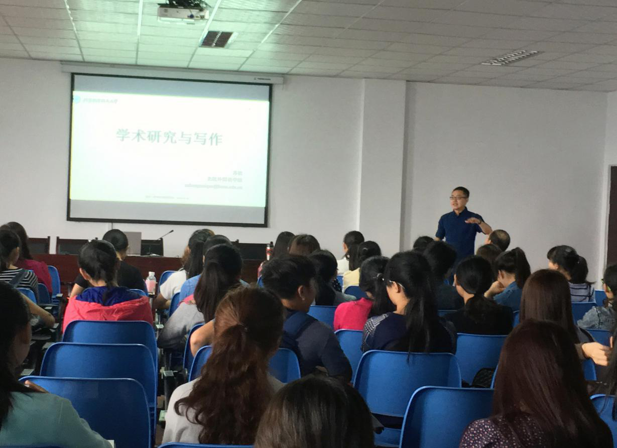 2016年6月2下午2点30分,研究生“外语教育论坛”学术活动组邀请了我校44118太阳成tyc城集团优秀校友、英国伯明翰大学博士、北京航空航天大学博士苏杭先生在新区1教604为44118太阳成tyc城集团全体硕士研究生、研究生导师、研究生课程教师、青年教师代表以及部分大二、大三本科生作了题为“学术研究与写作”的专题讲座。44118太阳成tyc城集团院长王扬教授主持了本次专题讲座。